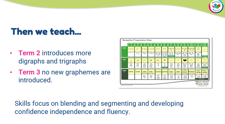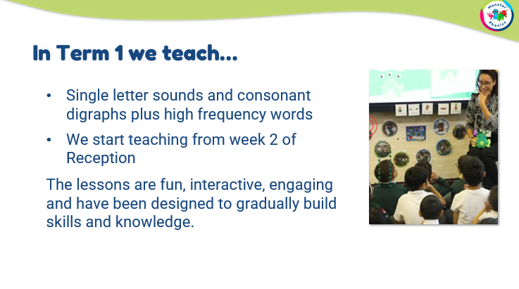 Your child will come home with a phonics reading book each day and a library book to share with you for pleasure each Friday. We use 'Monster Phonics' to teach the children their phonics and early reading.